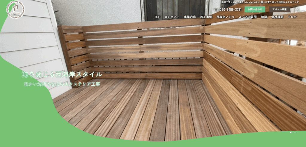 “海を感じる西海岸スタイル”を掲げ、湘南らしい素材感や色使いを取り入れた外構・庭づくりを得意としています。門塀・アプローチ・デッキ・カーポートなどの基本メニューに加え、植栽や小物で抜け感をつくる提案が上手です。