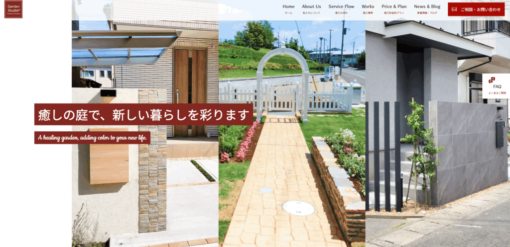 施工例が豊富で、質感のある素材使いや高さの納まりに配慮した収まりが目立ちます。直線と曲線の使い分けが上手く、建物の個性を引き立てる外まわりを目指す方に向いています。