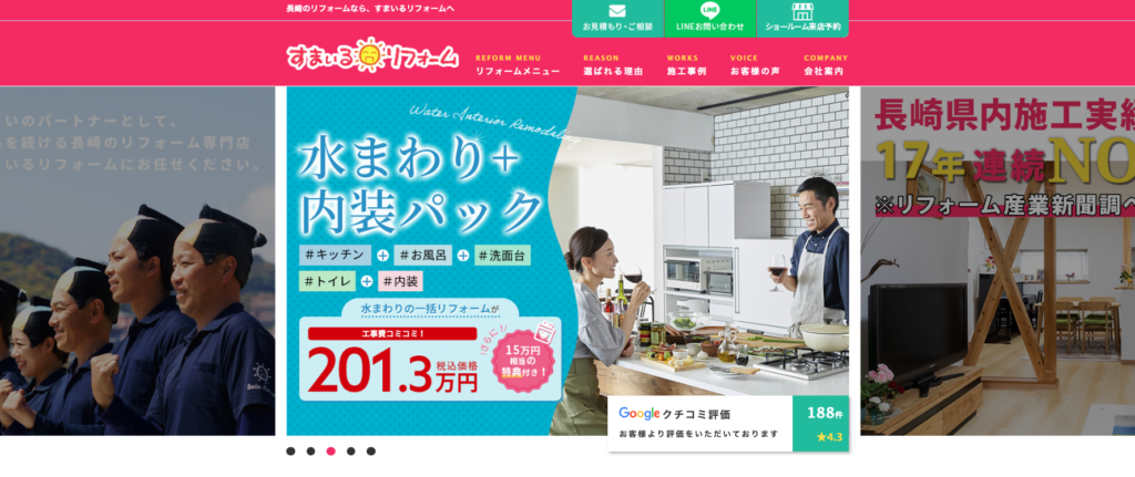 すまいるリフォームは、長崎市に本店を構えるリフォーム専門店で、株式会社中村工務店が展開しているブランドです。長崎県内で多数の施工実績を持ち、水まわりや内装、外壁塗装に加えて外構リフォームにも対応しているため、「住まい全体を一社にまとめて相談したい」人にとって頼りになる存在です。