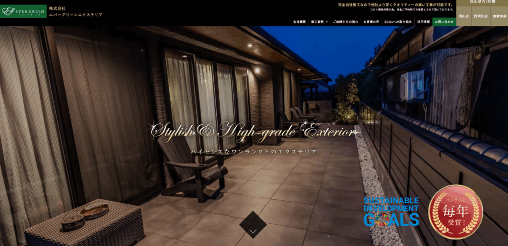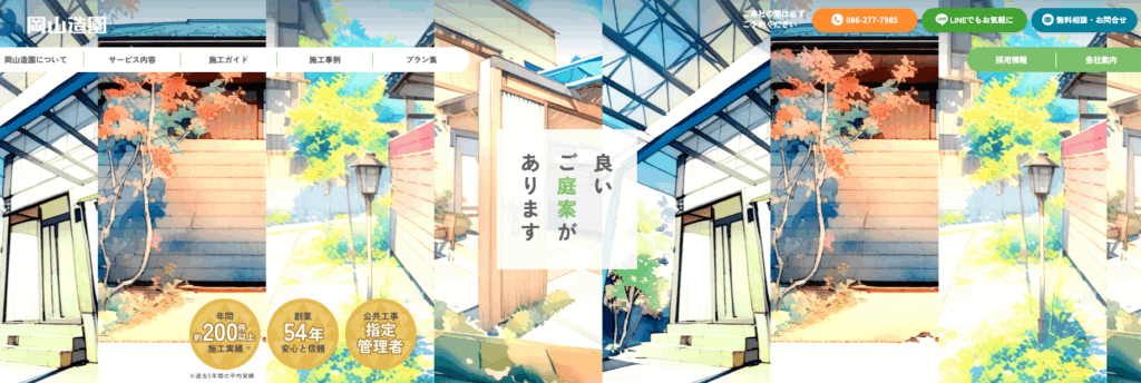 岡山市中区の老舗。門まわり・駐車スペース・境界・ライティング・庭づくりまで幅広く対応し、年間260件以上の施工実績を掲げる。