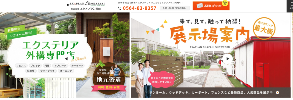 岡崎店では、新築外構からカーポート、ウッドデッキ、雑草対策まで、家まわりの悩みをまとめて相談できます。モデルガーデンを備えており、実物のカーポートやフェンス、植栽の雰囲気などを確認しながら打ち合わせできるため、完成イメージを具体的に持ちたい人に向いています。