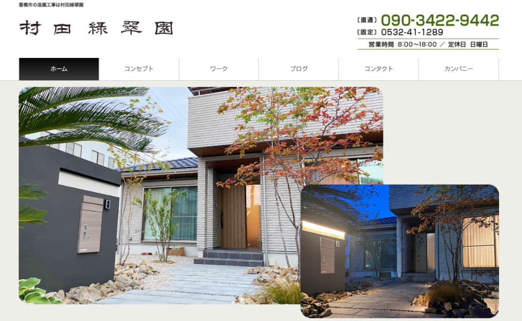 村田緑翠園は、豊橋市細谷町にある造園・外構工事店で、植物の特性に精通した植栽計画を得意としています。外構の硬い印象を植栽で柔らかく整え、四季ごとに楽しめる空間づくりを目指しているのが特徴です。